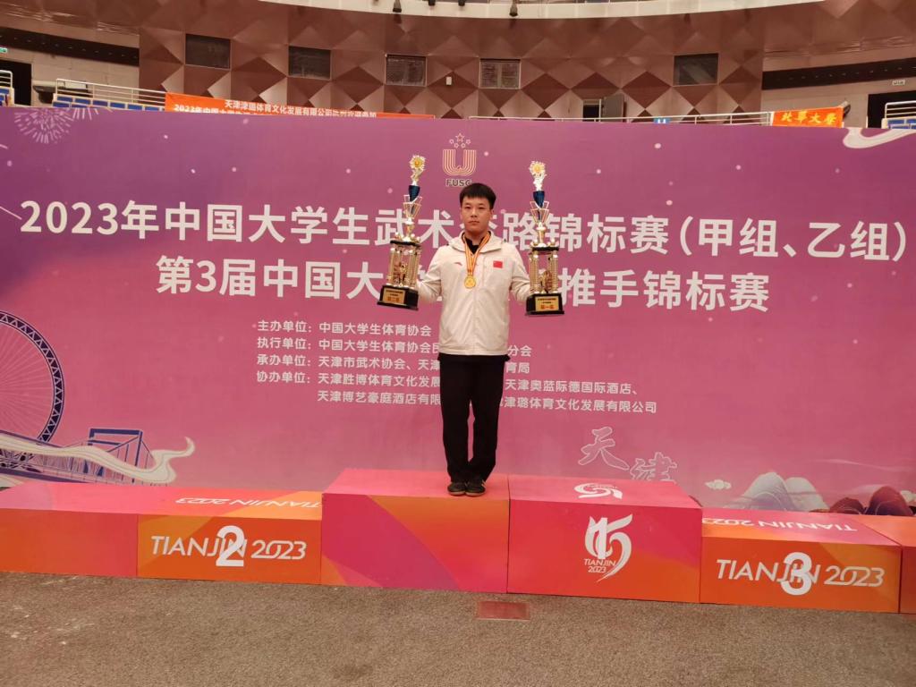 2023年10月5-11日,由中国大学生体育协会主办,中国大学生体育协会民族传统体育分会执行,天津市武术协会、天津市武清区体育局承办的第3届中国大学生太极推手锦标赛在天津落下帷幕。来自全国高校的41支代表队、200余名运动员参加了“推手实战”比赛。我校体育学院太极拳推手队9名运动员在“推手实战”比赛中参加了男子丙A组4个级别、女子丙组3个级别,以及男子丙组团体比赛,共获得4金6银3铜、团体第一名的优异成绩。
