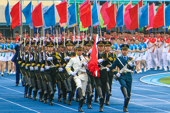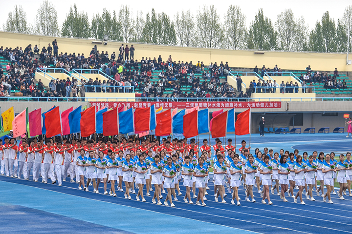 在首先举行的入场式上,伴随着激情洋溢的《运动员进行曲》,迈着铿锵的步伐,以国旗护卫队为先导,彩旗队、花束队、裁判员队以及由各个学院、职能部门、教辅单位组成的运动员方队,依次通过主席台接受检阅。