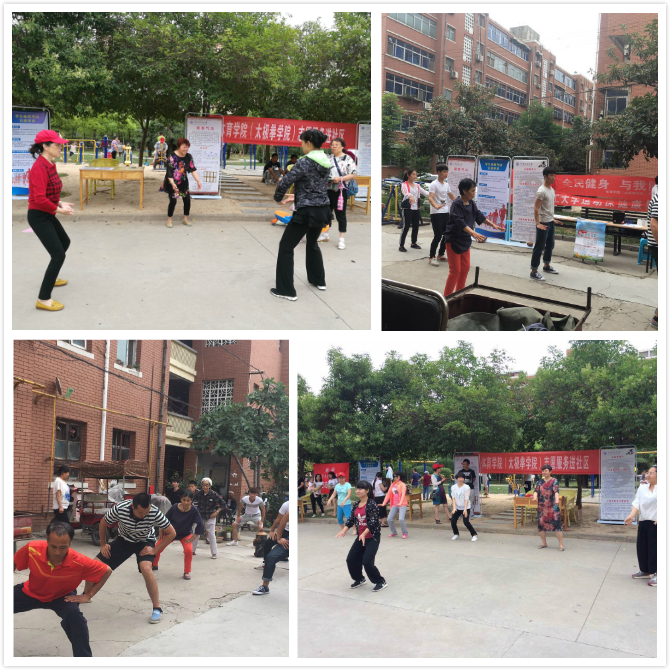 活动期间,体育学院分别在滨河花园小区、中华翰苑小区、学苑社区(大北二号院、东南东院)等4个地点安排多名志愿者,免费开展太极拳、健身气功、健身理论与方法、中招体育加试项目(跳绳、足球、长跑)等健身活动的指导和培训,通过现场展示、发放宣传材料,传授健身知识,提供健身咨询等形式,吸引附近居民参与到健身中来,在群众中进一步推广普及科学健身方法,培养社区群众科学有效的健身习惯、追求健康文明的生活方式。