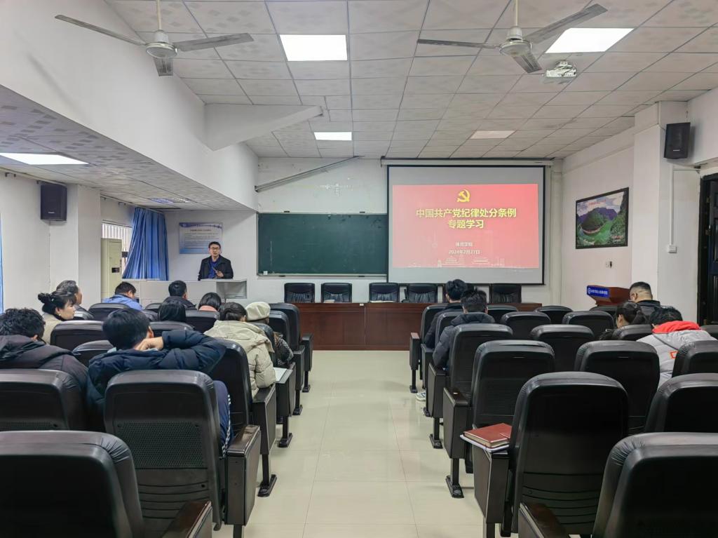 为牢固树立全体党员干部党规党纪意识,自觉做到守纪律、讲规矩,知敬畏、存戒惧,2月27日,体育学院组织全体党员集中学习了《中国共产党纪律处分条例》,会议由党委书记张纳新主持。