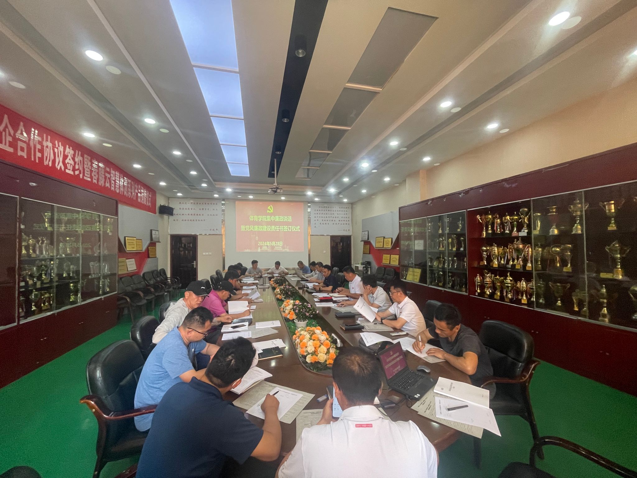 为深入学习贯彻习近平总书记关于党的自我革命的重要思想和全面从严治党重要论述,推动党纪学习教育走深走实,5月28日,体育学院举办集中廉政谈话暨党风廉政建设责任书签订仪式,党委副书记、纪检委员马志洋主持会议,学院全体中层以上干部参加会议。