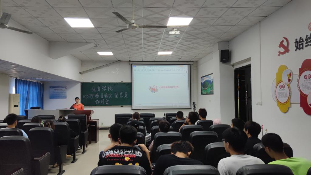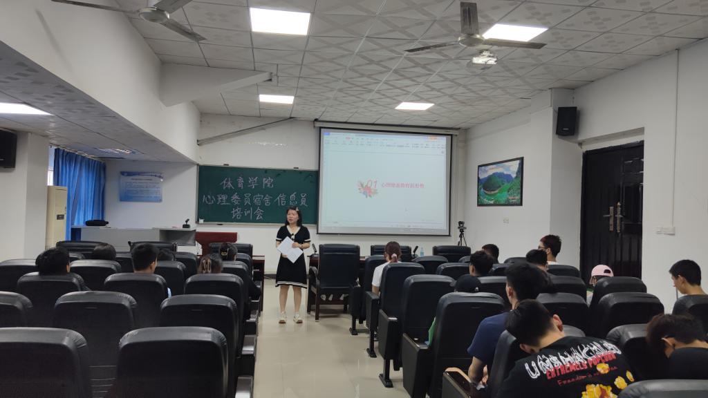 为进一步加强我院学生的心理健康教育,普及心理健康知识,明确心理委员与宿舍信息员的职责,充分发挥心理委员与宿舍信息员教育、管理与服务同学的能力,2023年5月31日上午十点半,体育学院在大会议室召开了心理委员与宿舍信息员培训会。会议由辅导员黄会娟老师、孙玉景老师主讲,体育学院全体心理委员及宿舍信息员共同参与。