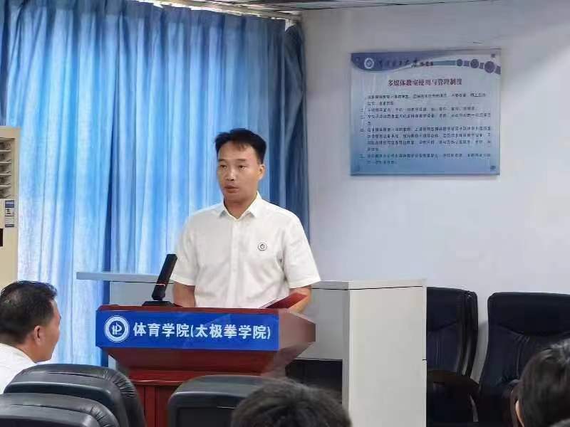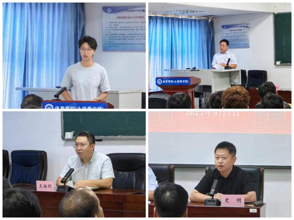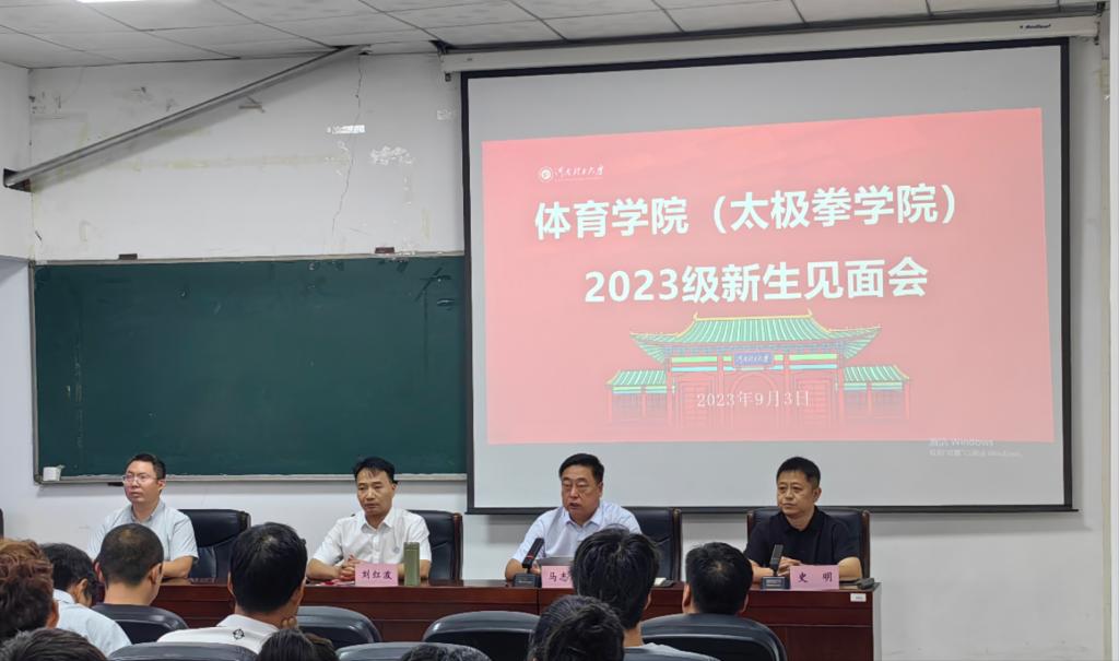 2023年9月3日上午9点,体育学院在大会议室举行2023级新生师生见面会暨开学第一课。体育学院院长刘红波、党委副书记马志洋、副院长王柏利、史明出席。体育学院教师代表李爱增、韩涛、邓正龙,高水平运动队教练员王庆丰、陆琦、原黎君、毋洪飞、孟昭雯,辅导员樊卫星、黄会娟、孙玉景等老师和125本科生参加。见面会由党委副书记马志洋主持。
