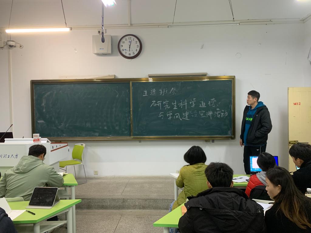 研究生教育是人才强国战略的重要部分,当代青年研究生必须牢记科学道德和学风建设的责任与使命,走好成长之路,守好道德底线。班会从学术诚信和学术规范的重要性出发,强调同学们要“诚信做人,道德立身”。班会过程中,同学们就如何度过研究生生活这一话题开展了激烈讨论,并各自表达了个人在研究生新阶段确立的目标和任务。班会进行中,又对同学们进行了宗教信仰等方面的思想教育,提醒同学们要崇尚科学、相信科学,自觉履行在校研究生的责任和义务,自觉遵守法律法规、校纪校规。