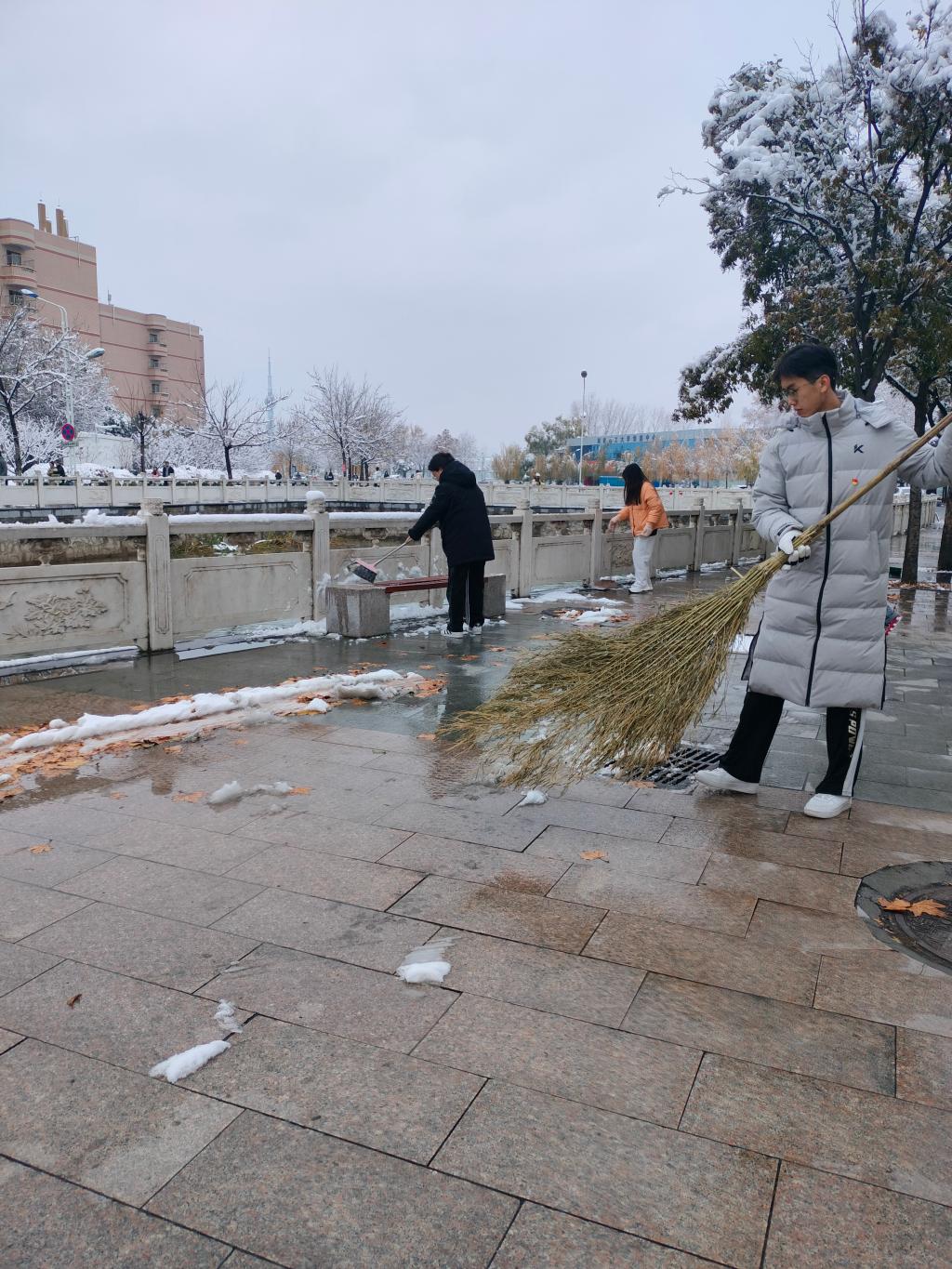 活动中,同学们奋力扫雪、积极除冰。大家不畏严寒,团结协作,手持铁锹、扫帚等工具对道路两侧的冰雪进行清理。路面上的积雪被一扫而空,道路状况得到了很大改善,为过往师生开辟出一条干净又安全的出行通道。