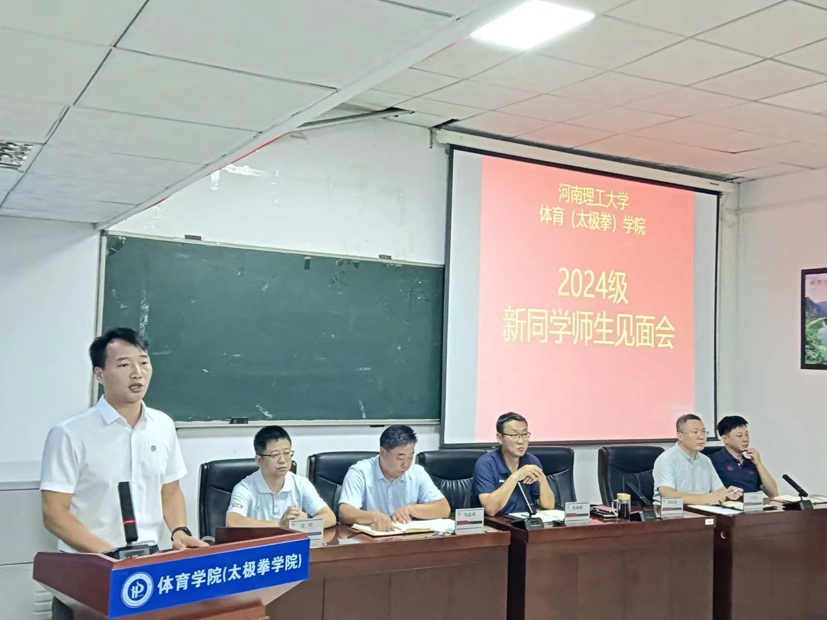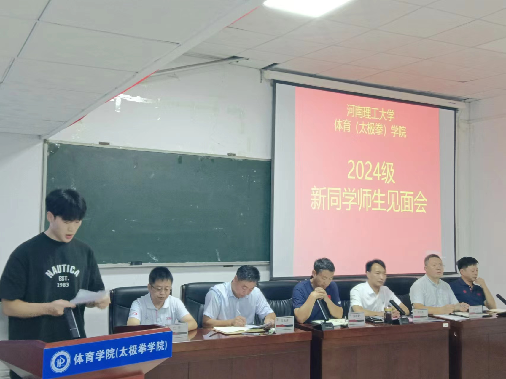 9月8日上午8:00,体育学院(太极拳学院)在学院大会议室举行2024级新生见面会暨开学第一课。体育学院领导班子、系室主任、教师代表、教练员、辅导员和140名新同学参加活动。活动由体育学院副书记主持。