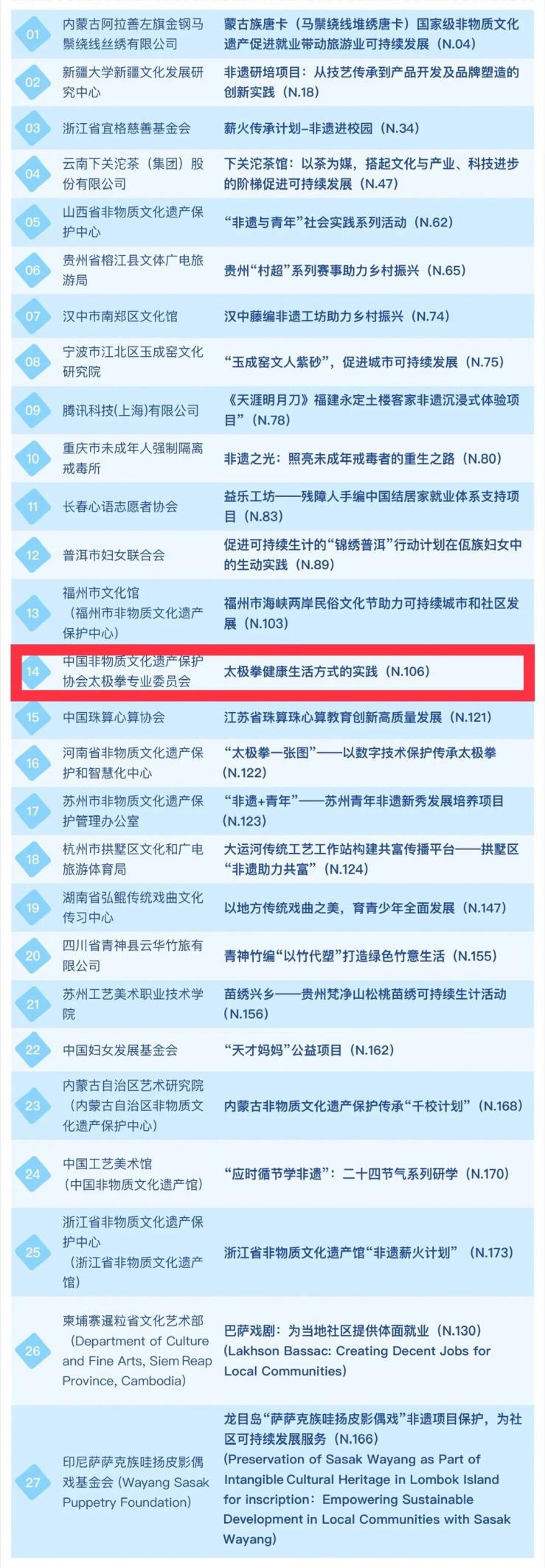 近日,由联合国教科文组织亚太地区非物质文化遗产国际培训中心(CRIHAP)、联合国教科文组织亚太地区非物质文化遗产国际研究中心(IRCI)及联合国教科文组织亚太地区非物质文化遗产国际信息与网络中心(ICHCAP)联合主办的2024年度亚太地区“非物质文化遗产促进可持续发展”案例征集和评选工作已圆满结束。在来自多个国家和地区的200多个参评项目中,经过专家团队的严格评审,最终有27个案例脱颖而出。其中,由我院副院长王柏利教授牵头撰写,河南理工大学与中国非物质文化遗产保护协会太极拳专业委员会联合申报的《太极拳健康生活方式的实践》项目成功入选。