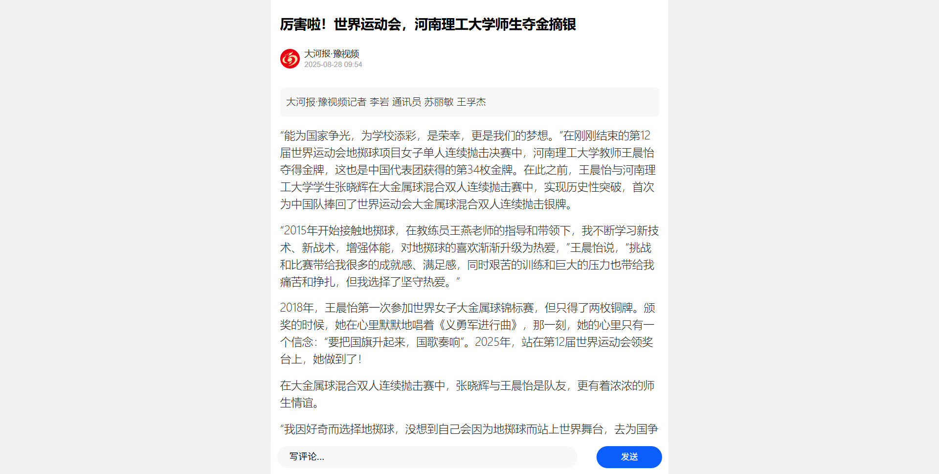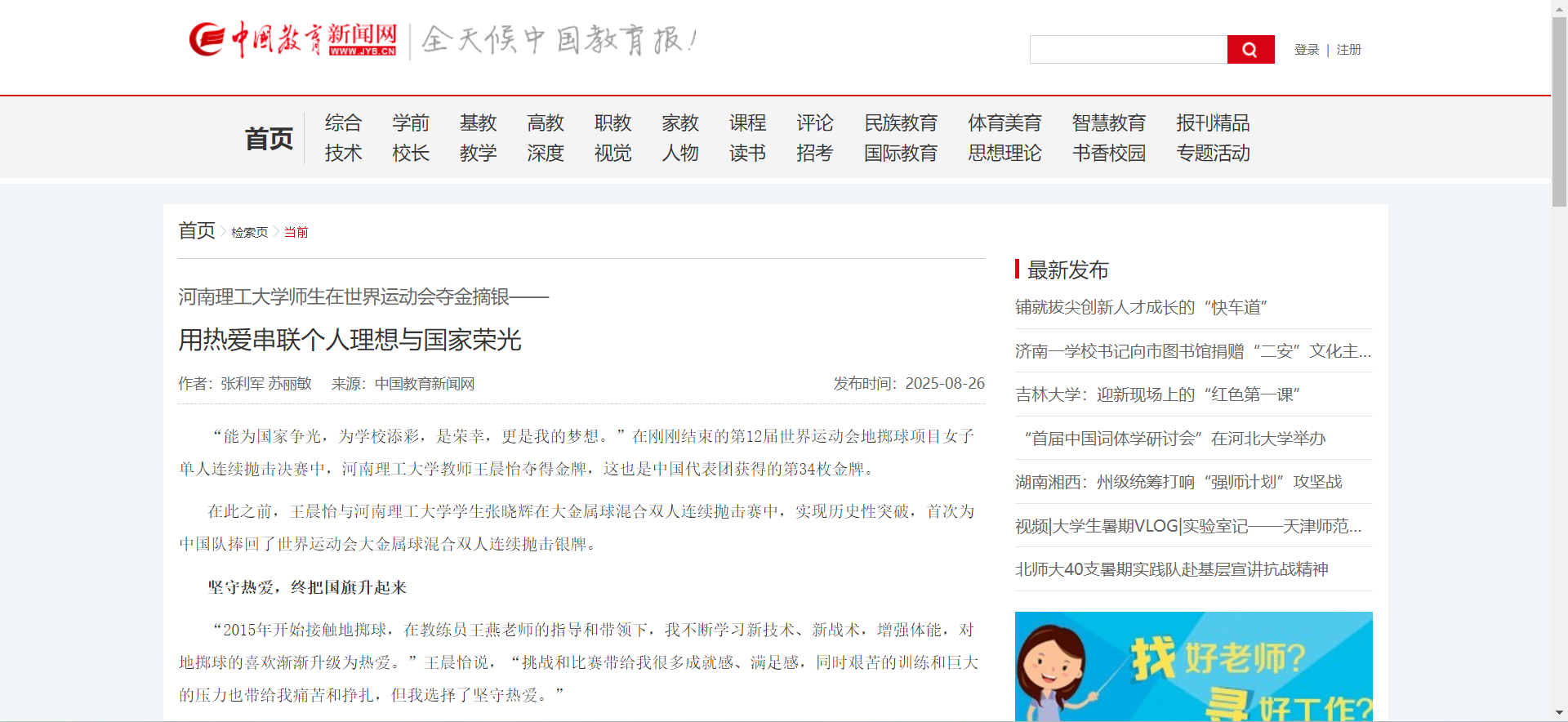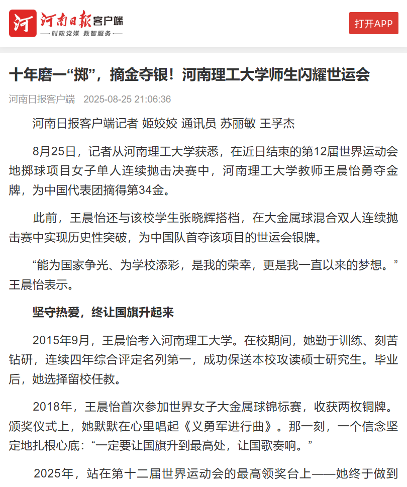 “此次夺冠经历将成为课堂上宝贵的教学素材,用以传递中华体育精神,鼓励学生在任何运动或事务中始终保持热爱、不畏艰难。”王晨怡说。目前,她主要负责河南理工大学地掷球课程,计划通过播放比赛高清视频让学生感受竞技体育的魅力,并拆解技术细节帮助学生理解动作要领,同时以自身经历引导学生正视挫折、勇于挑战,坚信成功需要坚持与努力。