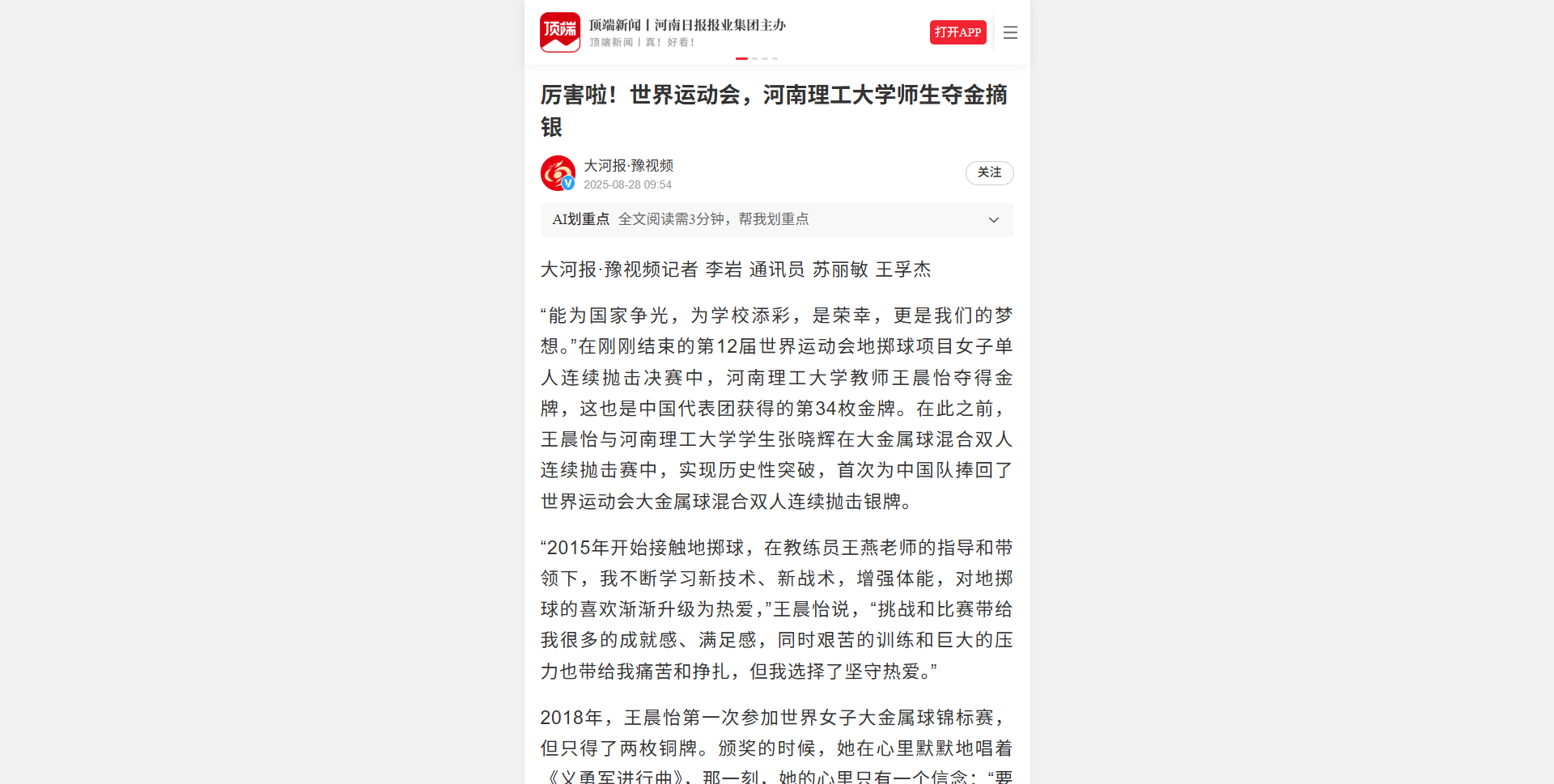 8月25日,记者从河南理工大学获悉,在近日结束的第12届世界运动会地掷球项目女子单人连续抛击决赛中,河南理工大学教师王晨怡勇夺金牌,为中国代表团摘得第34金。