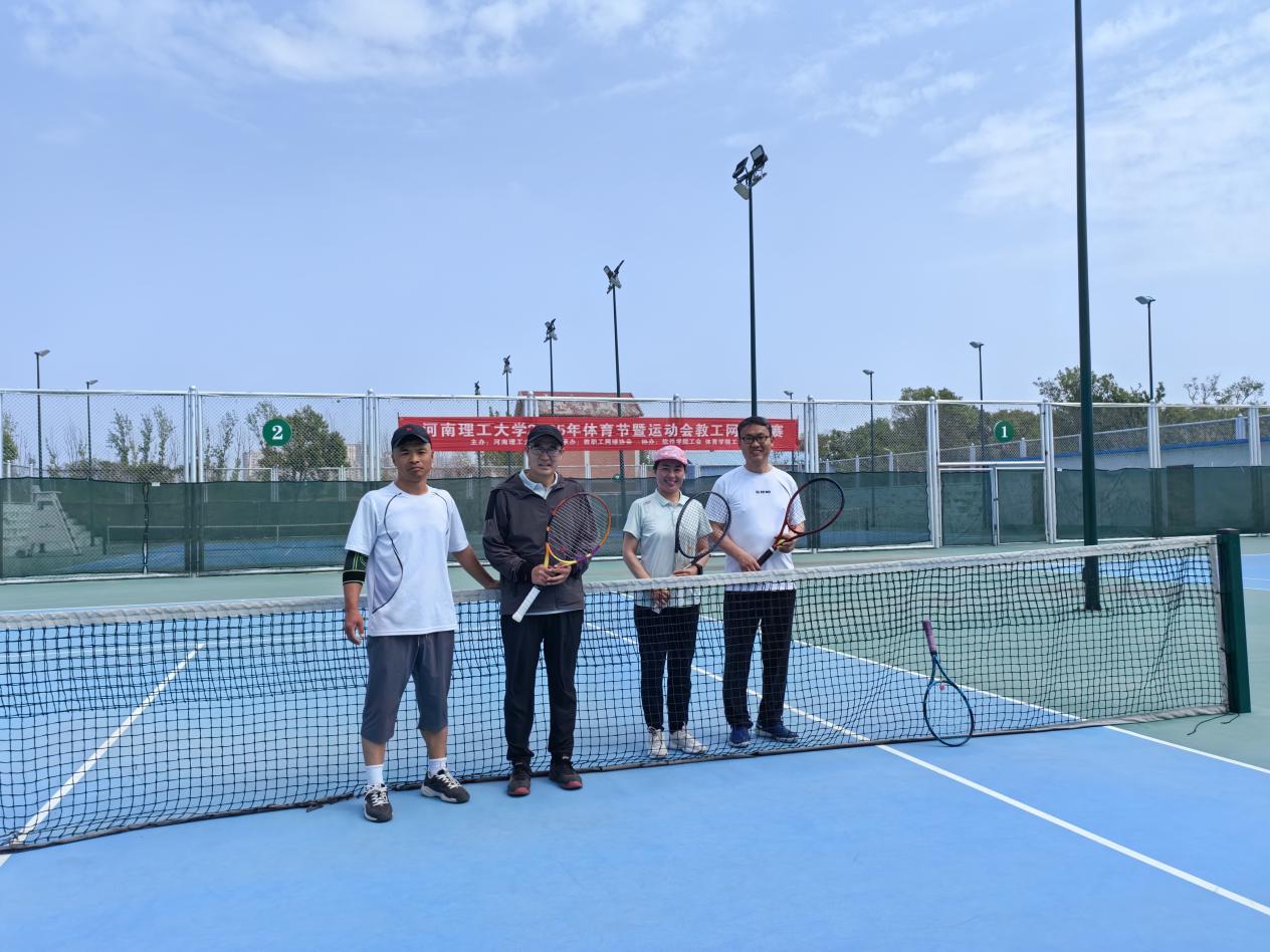 教职工们纷纷换上专业的网球装备,队友间默契的配合更是赛事的一大看点,他们通过精准的战术布局和灵活的场上应变,充分展现了精彩的球技、良好的精神面貌和团队合作精神。经过激烈角逐,最终各项目优胜者脱颖而出,体育学院一队与软件学院获得团体赛项目冠亚军;建艺学院金弘大与土木学院王一新、体育学院王枫与卢涛分别获得50岁以下双打项目冠亚军;机关工会杨小林与体育学院龚希丹、体育学院工会张纳新与杨海兵分别获得50岁以下双打项目冠亚军。