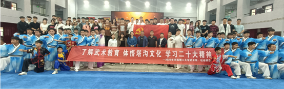 活动受到了少林塔沟武术教育集团、少林鹅坡武术教育集团、陈家沟景区管理局、和式太极拳学院等单位领导和师生的热情接待,安排了发展历史介绍、校风校训讲解、教学成果展示、人才培养设置、武术表演活动、校园文化生活等各方面内容。同时,我院学生还与调研单位师生进行了密切深入的互动和交流。