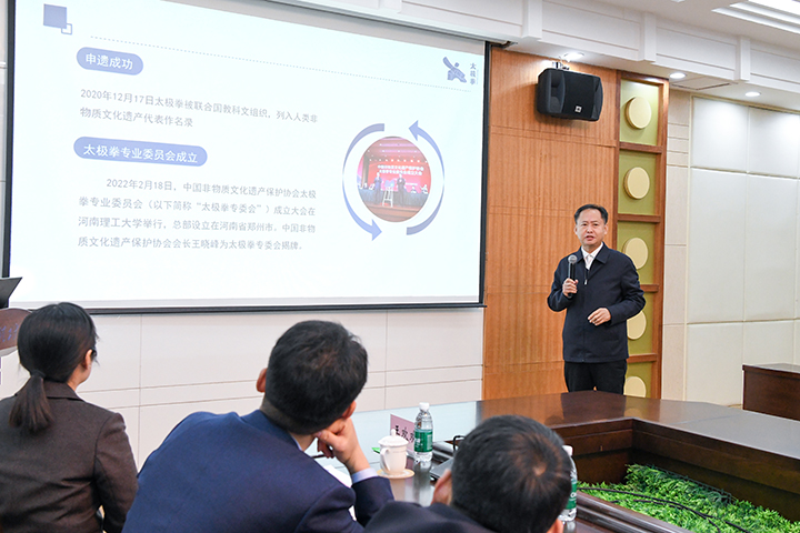 李振华从国内学科建设现状、学科建设目标、学科建设方向、学科师资队伍、学科建设内容和成效、学科建设措施、学科建设支持和保障等7个方面,全面汇报了学校太极拳学科建设整体情况。