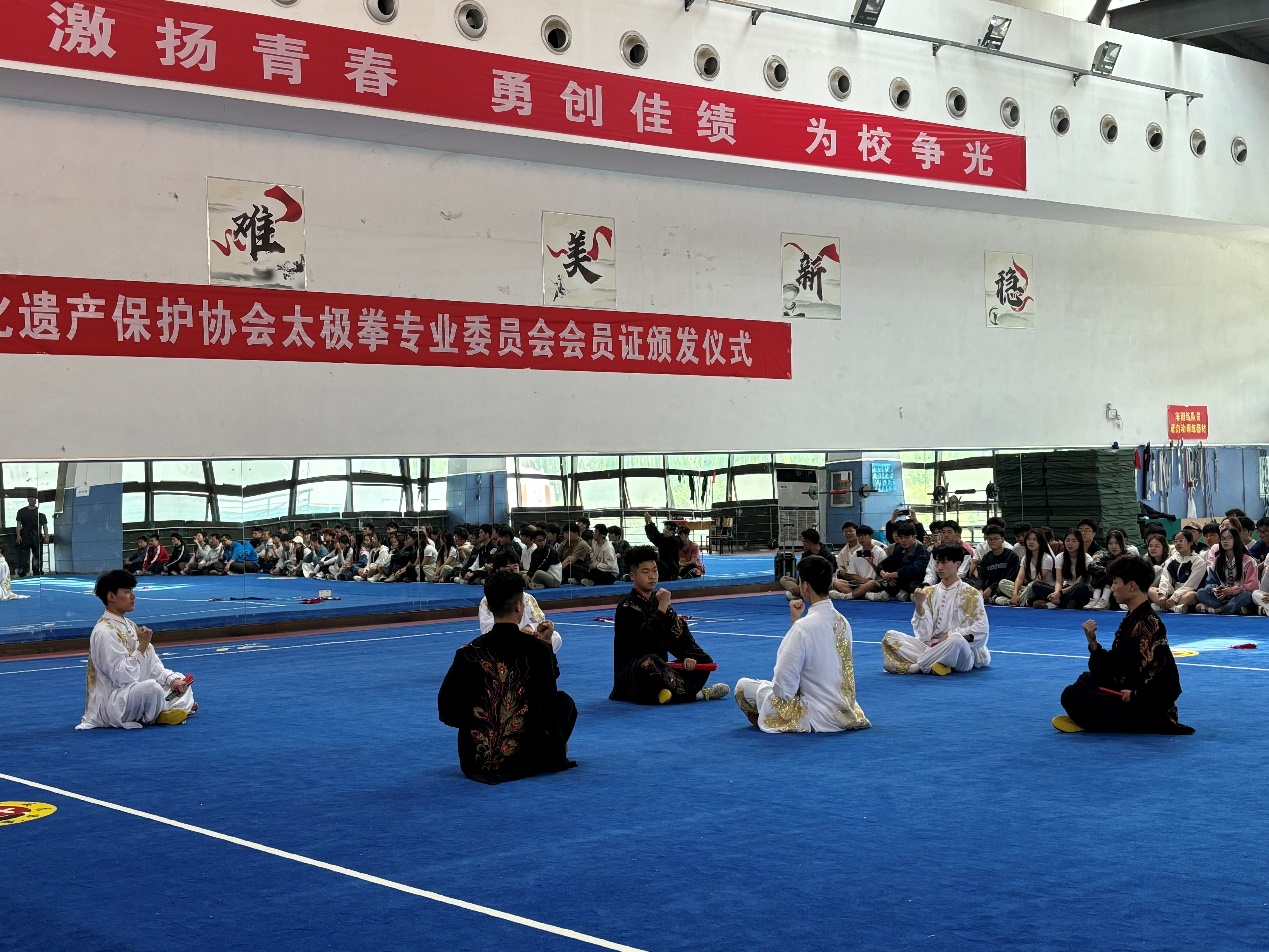 活动现场还呈现了一场精彩的太极表演,同学们身着太极服,手持春秋大刀、太极扇,以行云流水的动作展现了春秋大刀“大刀如猛虎”的风格,一招一式,有威武,凛冽的气概。太极与扇结合,刚柔并济、攻守兼备,充满了飘逸潇洒的美感与武术的阳刚。在现场热烈的气氛中,大家共同欣赏了这些精彩表演,他们精湛的技艺引起了现场拳友的阵阵掌声,将活动推向高潮。
