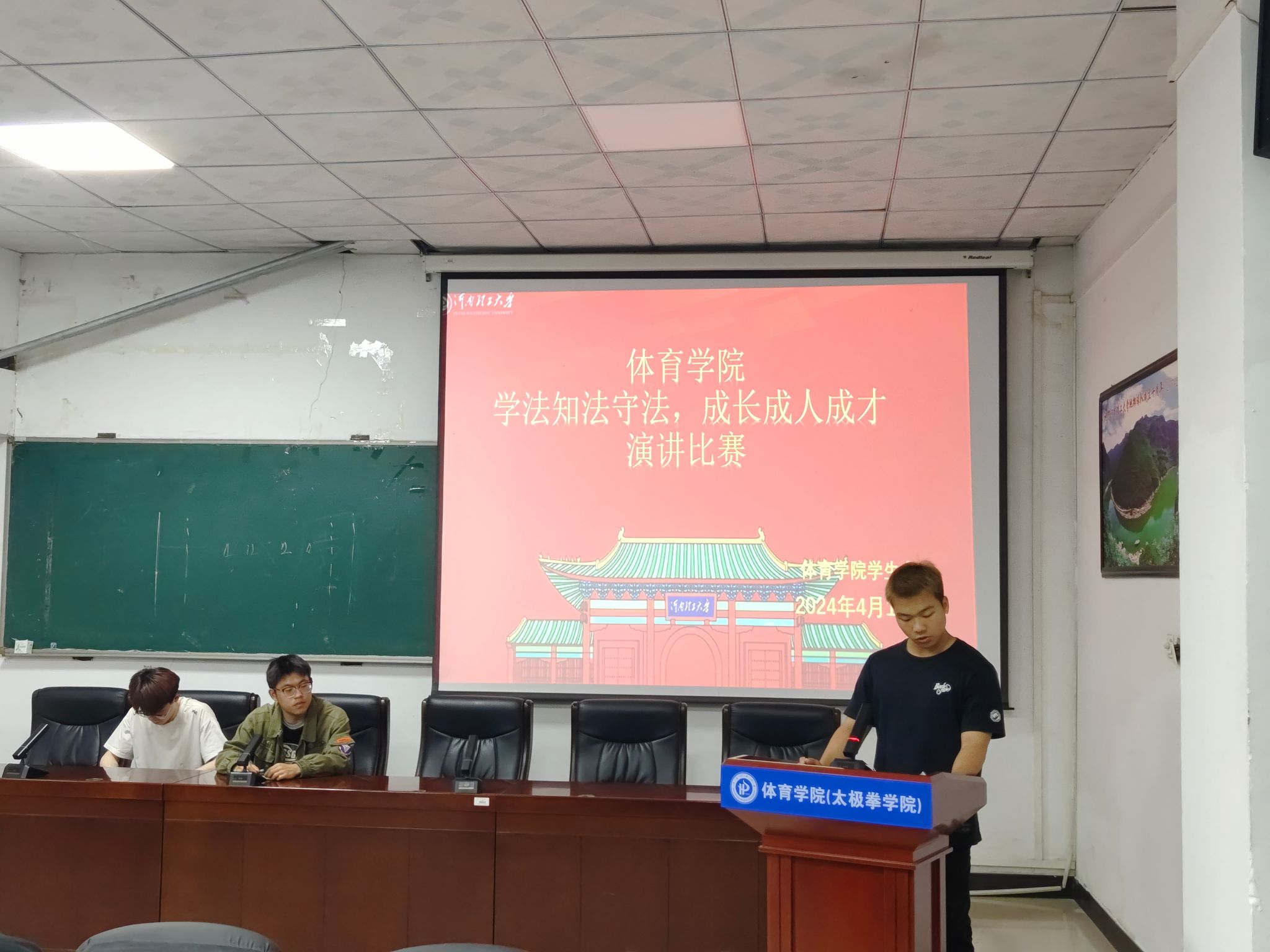 为了宣传法律知识,弘扬法法治精神,增强公民在法律面前一律平等观念,权利义务相一致观念,公平正义观念,牢固树立并自觉践行社会主义法治理念,推进依法治国基本方略的贯彻落实。4月16日学生会在体育学院大会议室进行了主题为“学法知法守法成长成人成才”的演讲比赛。本次演讲活动由学生会主席团负责人王志豪主持。