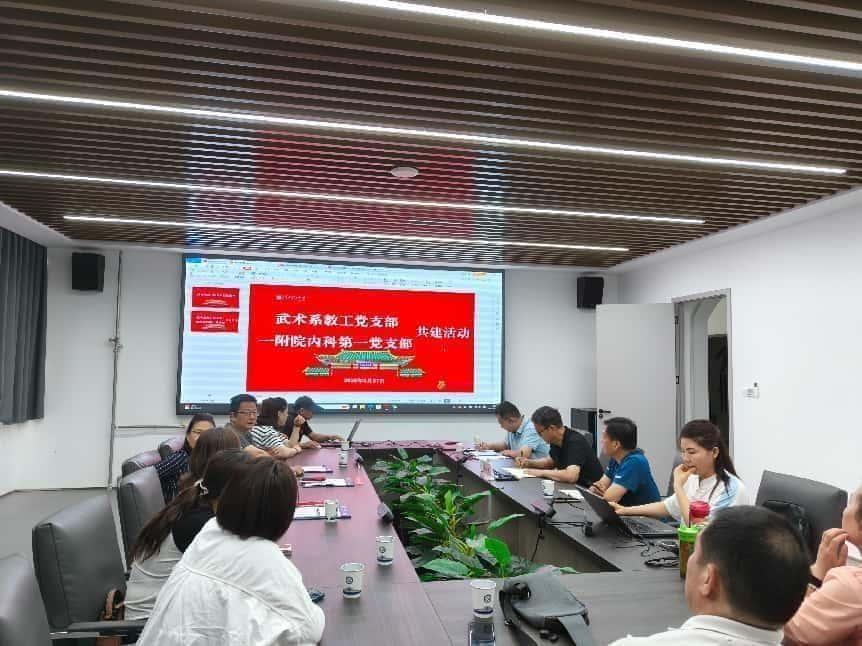 为积极推进太极拳学科的交叉融合建设,建立与医学院相关科室单位的合作机制,2025年5月27日,武术系教工党支部与一附院内科第一党支部开展共建活动,活动在太极拳实验室大会议室举行。体育(太极拳)学院党委书记张纳新、一附院院长王虹参加了共建活动,活动由武术系教工党支部齐风猛主持。