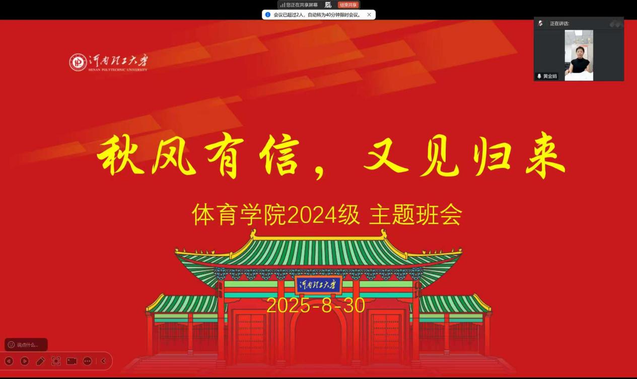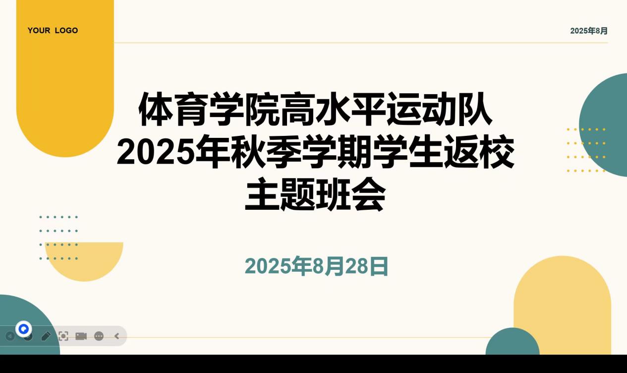 为切实做好2025年秋季学期开学准备工作,确保学生安全有序返校、平稳过渡学习生活,8月30日,体育学院全体学工队伍组织召开线上专题会议。本次会议以“秋风有信・又见归期”为主题,由各年级辅导员按班级、分专业逐一主持召开,覆盖全体在校学生,围绕“安全返校、科学规划、状态调整”三大核心内容,全面部署新学期学生工作。