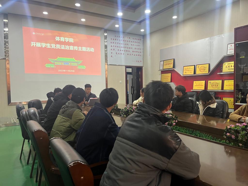 为深入学习贯彻习近平法治思想,弘扬社会主义法治精神,2023年11月29日,体育学院本科生党支部在学院小会议室举行了法治宣传教育活动,本科生党支部全体学生党员参加本次活动。
