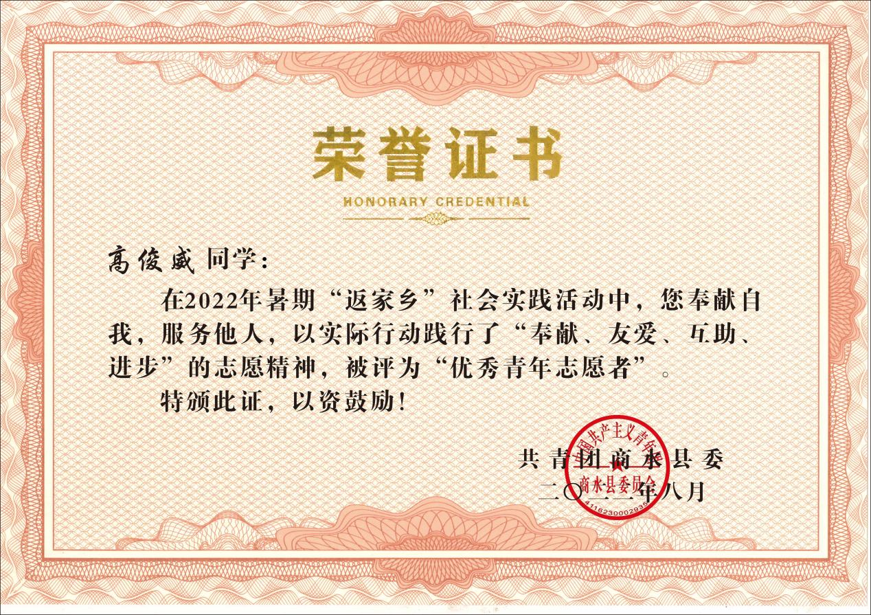 在担任学生干部的两年里,高俊威同学能够游刃有余的处理班级各项工作,获得了老师同学一致认可。在校期间,多次被评为各类“先进个人”。在抗击新冠疫情的攻坚战中,积极踊跃投身家乡疫情防控一线,被评为“优秀青年志愿者”。同时担任商水县大学生联盟副主席,参加商水县“快乐成长”乡村学校少年宫志愿服务暑期特别实践活动,主动在志愿服务中贡献自己的力量。