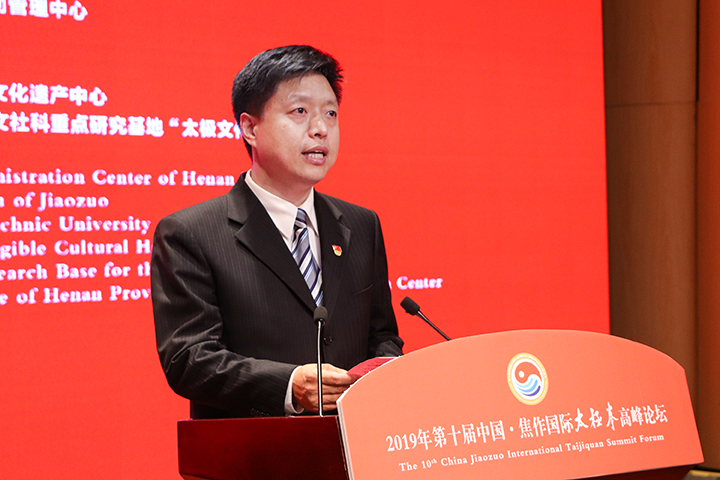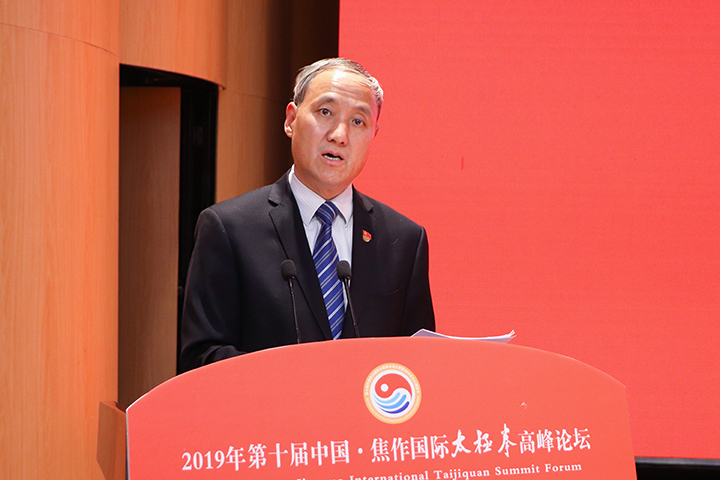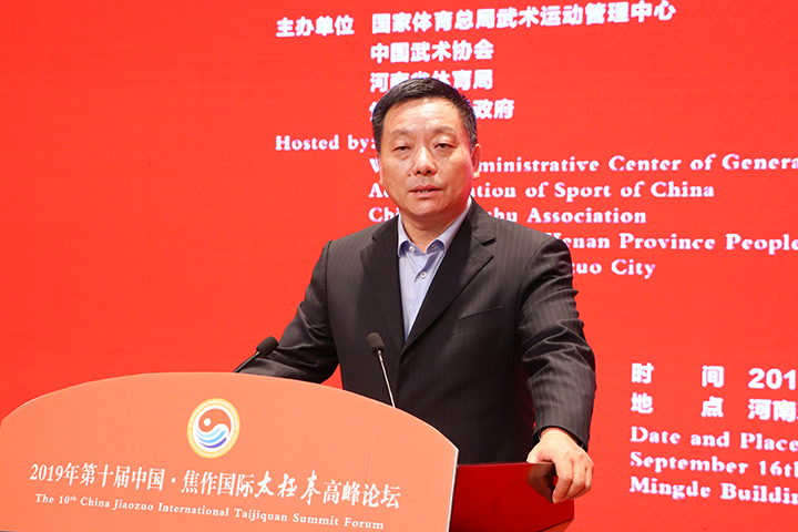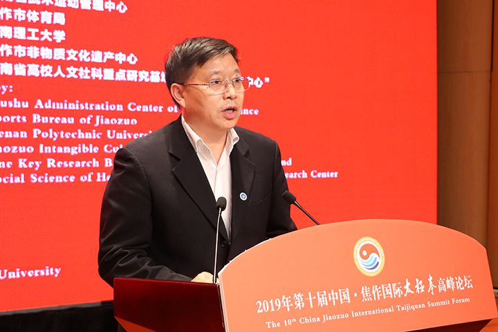 刘涛致欢迎辞。他指出,焦作北依太行、南临黄河,历史文化底蕴深厚,是太极拳的发源地,被国家武协命名为“太极圣地”。太极拳深深植根中华传统文化,以中国传统儒道哲学中的太极、阴阳辩证理念为核心,集颐养性情、强身健体、技击对抗为一体,内外兼修、刚柔相济,其动作结构、运动特点、美学特征和内在意蕴反映了中国传统文化天人合一的整体观、形神合一的生命观、对立统一的辩证观。经过300 多年的流传,发源于温县陈家沟的太极拳衍变出陈式、杨式、吴式、孙式、武式、和式等诸多流派,传播到150多个国家和地区,全球习练人数达3亿人。可以说,作为中国传统文化的一种符号象征,太极拳已成为对外文化交流的重要桥梁和纽带。近年来, 焦作市委、市政府以打造“世界太极城、中原养生地”为目标,深度挖掘太极拳的文化价值、经济价值、社会价值,有力推进了太极拳的蓬勃发展和文化传播。此次国际太极拳高峰论坛是全球太极理论研究的一次学术盛会,希望大家共同为太极拳发展建言献策。相信有了大家的关心和支持,有了我们的共同努力,太极拳这个民族传统文化瑰宝一定能焕发出更加夺目的光彩。